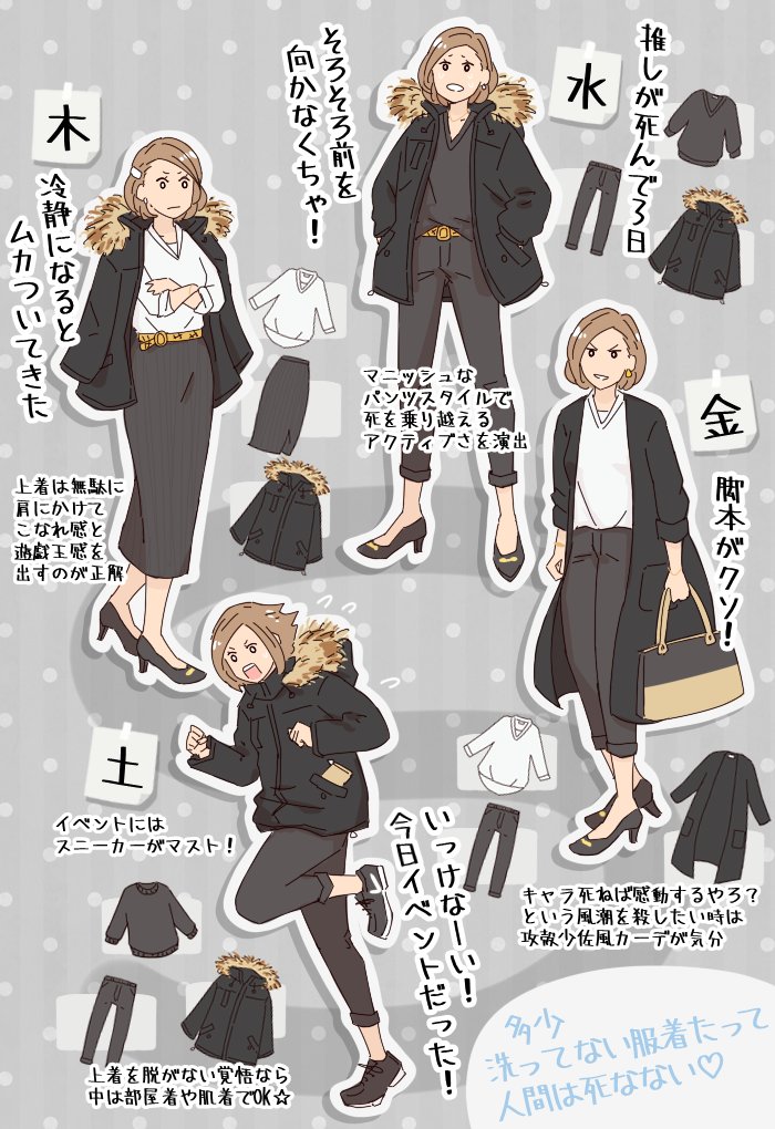 推しが死んだ女オタクの限界ファッション 1週間着回し喪服コーデ たまに推しが死ぬので参考になります 推しの健康をお祈り申し上げます Togetter